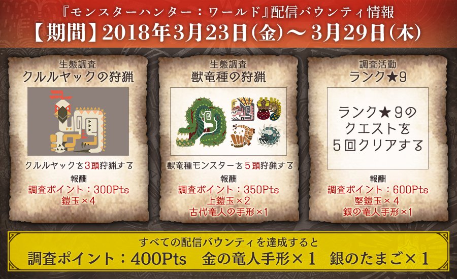 各バウンティを達成すれば、調査ポイントや鎧玉、竜人手形などが入手可能です! #MHW_PR pic.twitter.com/SWhlHozmLf