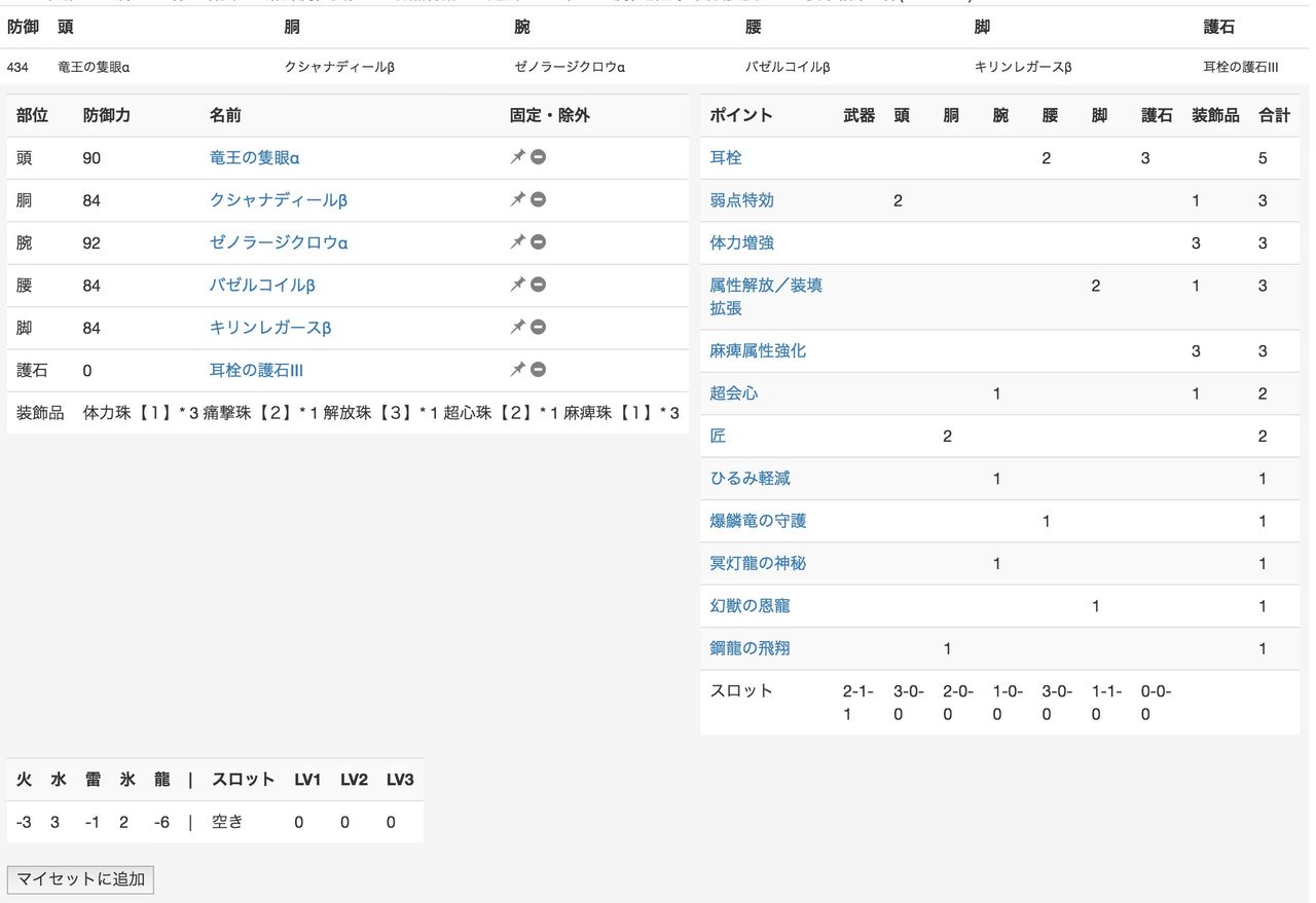 耳栓、体力、弱特、ひるみ、開放、麻痺までは絶対入れたくてあとはなんとなく入れれるやつ入れてみた
