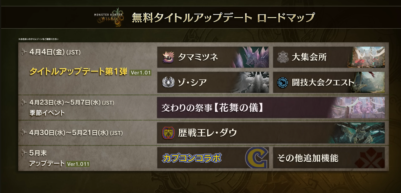 無料タイトルアップデート第1弾の配信日や主なアップデート内容についてご紹介いたします。#モンハンワイルズ #MHWilds pic.twitter.com/BUPaZJnlmN
